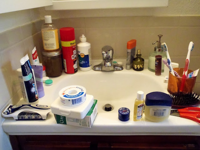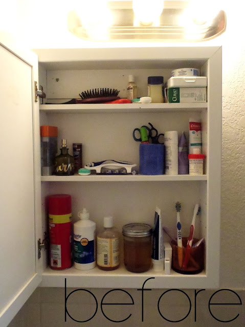For now though, it works. I could have gone and purchased some nifty cabinet organizers or even could have made a magnetic holder for the inside of the medicine cabinet but wanted to keep this task free. Because free is good.