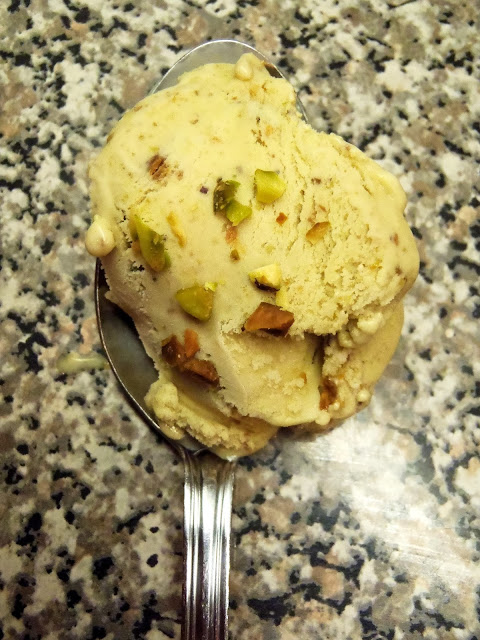 Stir in heavy cream then freeze in ice cream maker according to manufacturers directions. About half way through processing, add in chopped pistachios.