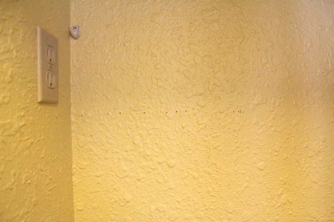 Once I had an idea of where I wanted the shelves, I attempted to find a couple of wood studs. Now, studs are my nemesis. I’ve tried stud finders , I’ve tried knocking and I’ve tried measuring. What does the trick for me is finding them by hammering nails into the drywall. If they go in all the way, no stud. If they hit something… well, you guessed it… there’s a stud.