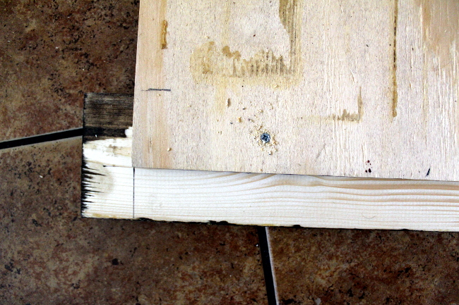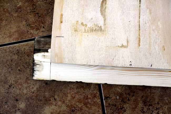 I placed the two shorter boards on the floor (wrong side up), then laid the plywood, chalk side down, on the boards.
