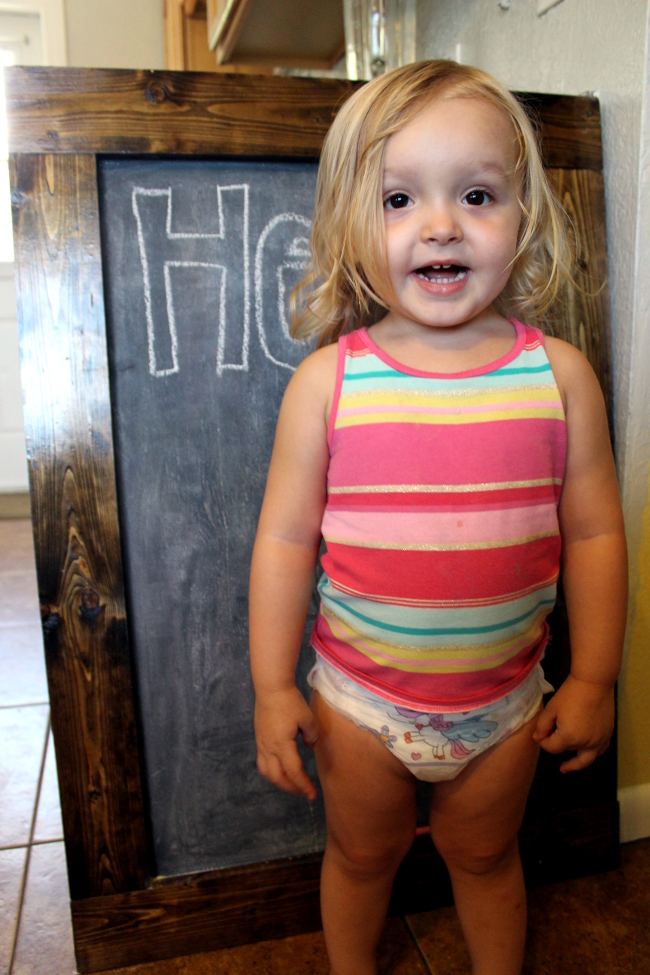 Eliana was happy to coach the chalkboard into modeling by saying, “Okay chalkboard, say cheese!” Then of course she needed to get in on the action.