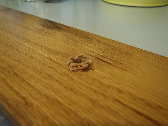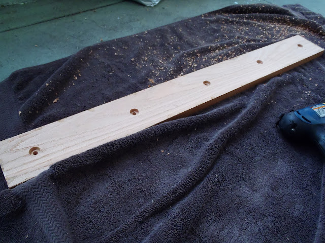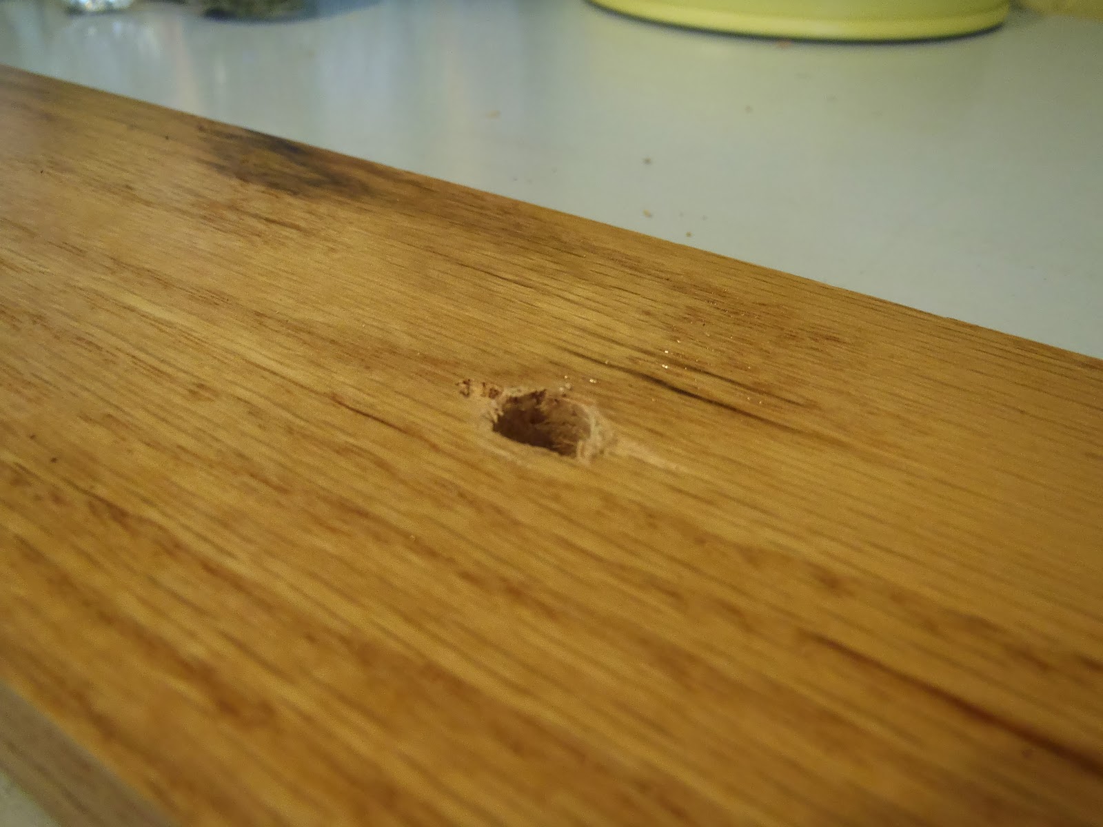 After you have everything marked, take your spade bit (mine measured 5/8″) and drill in just enough to fit the head of the screw in level with the wood. Repeat for each knob.