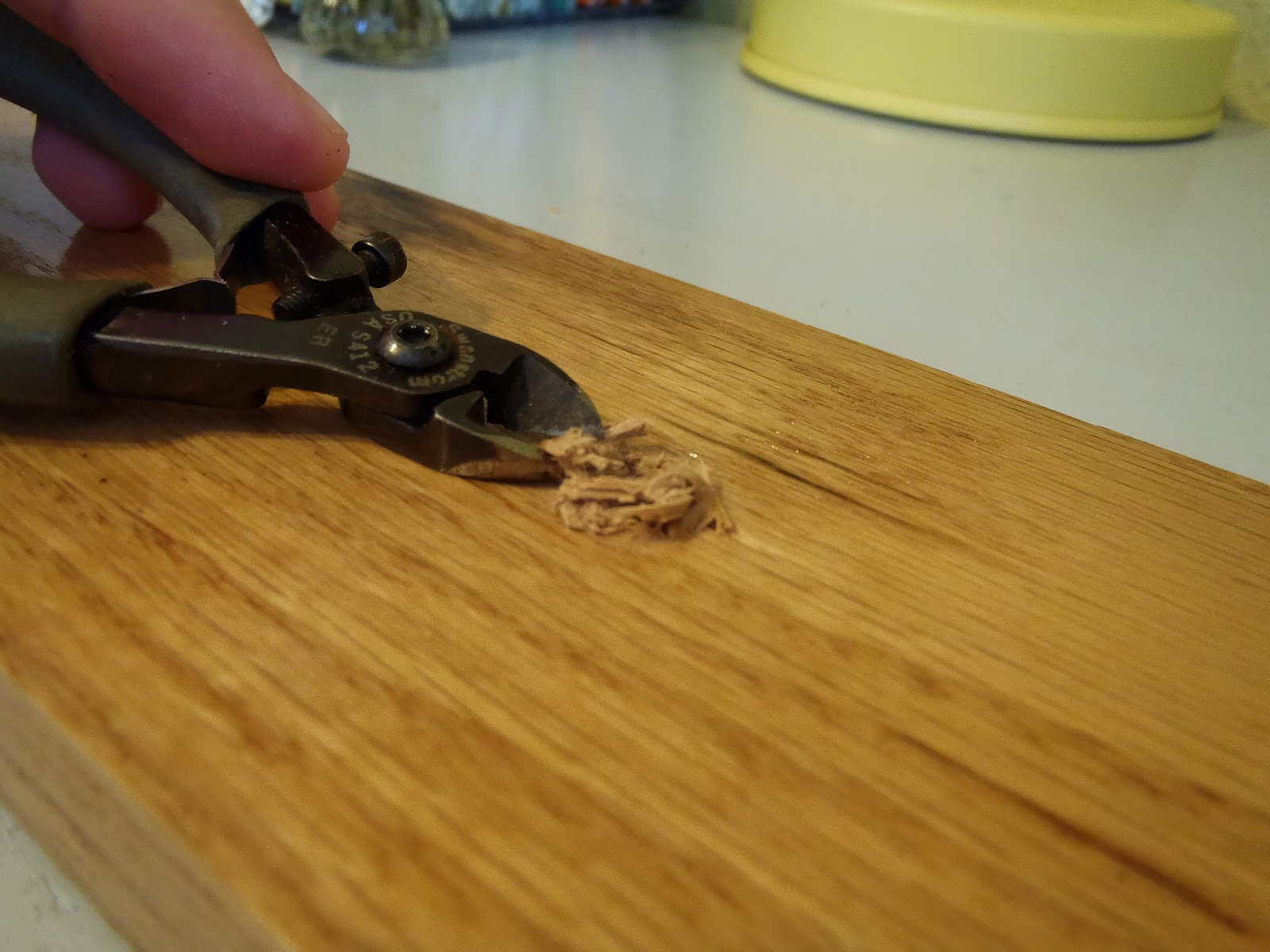 Then, take your drill bit (mine measured 3/8″) and drill through the wood, making sure it is centered to the spade bit indent. Note: The drill bit I used was made for concrete, whoops. I didn’t have any other bit that fit and not wanting to purchase one, I used what I had on hand. It did take a considerable amount of time to drill through the wood, which I’m sure is due to this fact. I know, this probably wasn’t the best decision, but I survived with all of my fingers and toes and legs and arms.