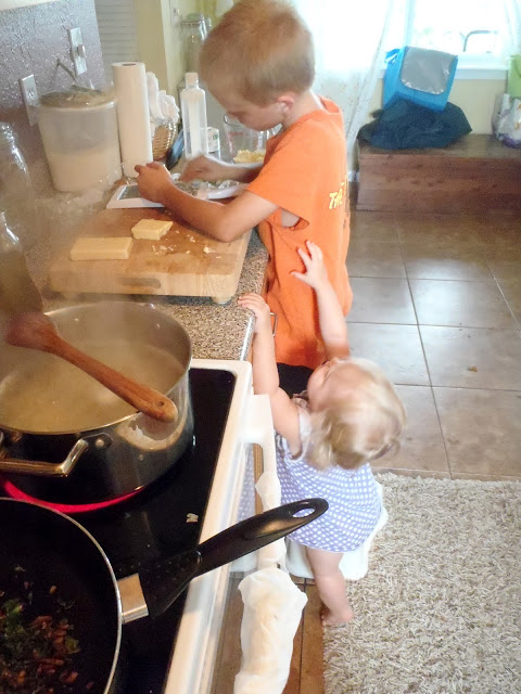 Next thing to do is to make a rue. Melt 4 tablespoons butter in a pot, then add 1/4 cup flour. Stir for a minute, making sure not to burn the flour. I burnt mine while distracted and insisted that I had ruined dinner, but my sweet husband kept reassuring me that I didn’t, telling me it smelled tasty. Add 2 3/4 cup heated milk to the flour and butter, I warmed mine in a small sauce pan while the butter was melting. Stir until the mixture thickens and begins to bubble. I should mention that before or while doing this, make sure to shred your cheese. You will need total 2 1/4 cup of sharp white cheddar (I bought what my grocery store called aged cheddar, and it was obvious that it was white), 3/4 cup of Gruyere, and a 1/2 cup of Parmesan. I went extra fancy and used grated Parmesan and Romano cheese that comes in the bottle, I know, I outdid myself. I enlisted the help of my son Elijah to shred the cheese for me, and Eliana made sure to supervise.