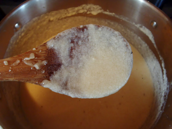 Once the base of the sauce thickens, mix in most of your cheese, which will be 1 1/2 cup of the cheddar, a 1/2 cup of Gruyere, and all of the Parmesan, and season with some salt and pepper. The recipe says to add nutmeg and cayenne pepper, but I am not a fan of nutmeg and was very hesitant to make it spicy with cayenne, so I opted out of those spices. The mixture was looking pretty grainy to me, which worried me, but I set my worries aside and hoped for the best.