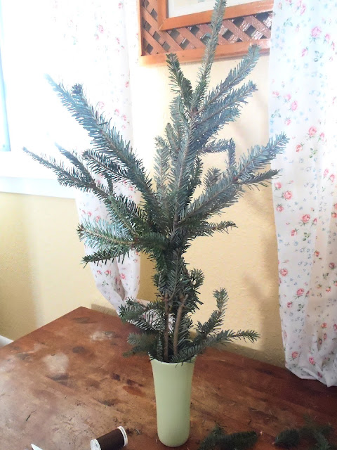 Philip had a great idea to pick up Christmas tree branches from a tree stand to bring some Christmas into the house without spending a fortune on a live Christmas tree. I decided to take the branches and arrange them to look like a Christmas tree. Or at least attempt to make them look like one. I first picked out some branches I thought would make a nice tree top. I held them together by tying them with brown sewing thread and placing them in this simple green vase that I had on hand.