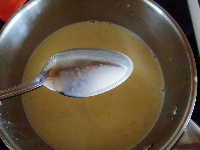 Now you need to sort of cook that eggy milky mixture over medium heat until it thickens. You are looking for it to coat the back of a spoon. To test, dip a spoon in the cream and run your finger along the back of the spoon. If the line stays in tact, you are good to go.
