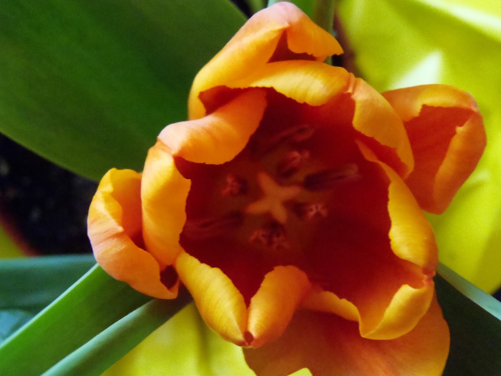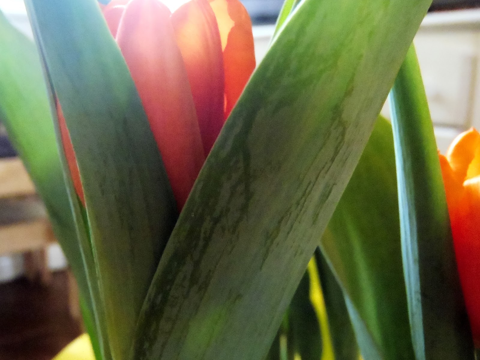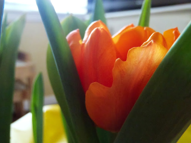 I am so intrigued at how even just one petal on a tulip contains different shades of color. When I picked this up at the store I could not tell what color they were since they were not yet in bloom. I was very happy to see orange flowers begin to peek out from their green leaves.