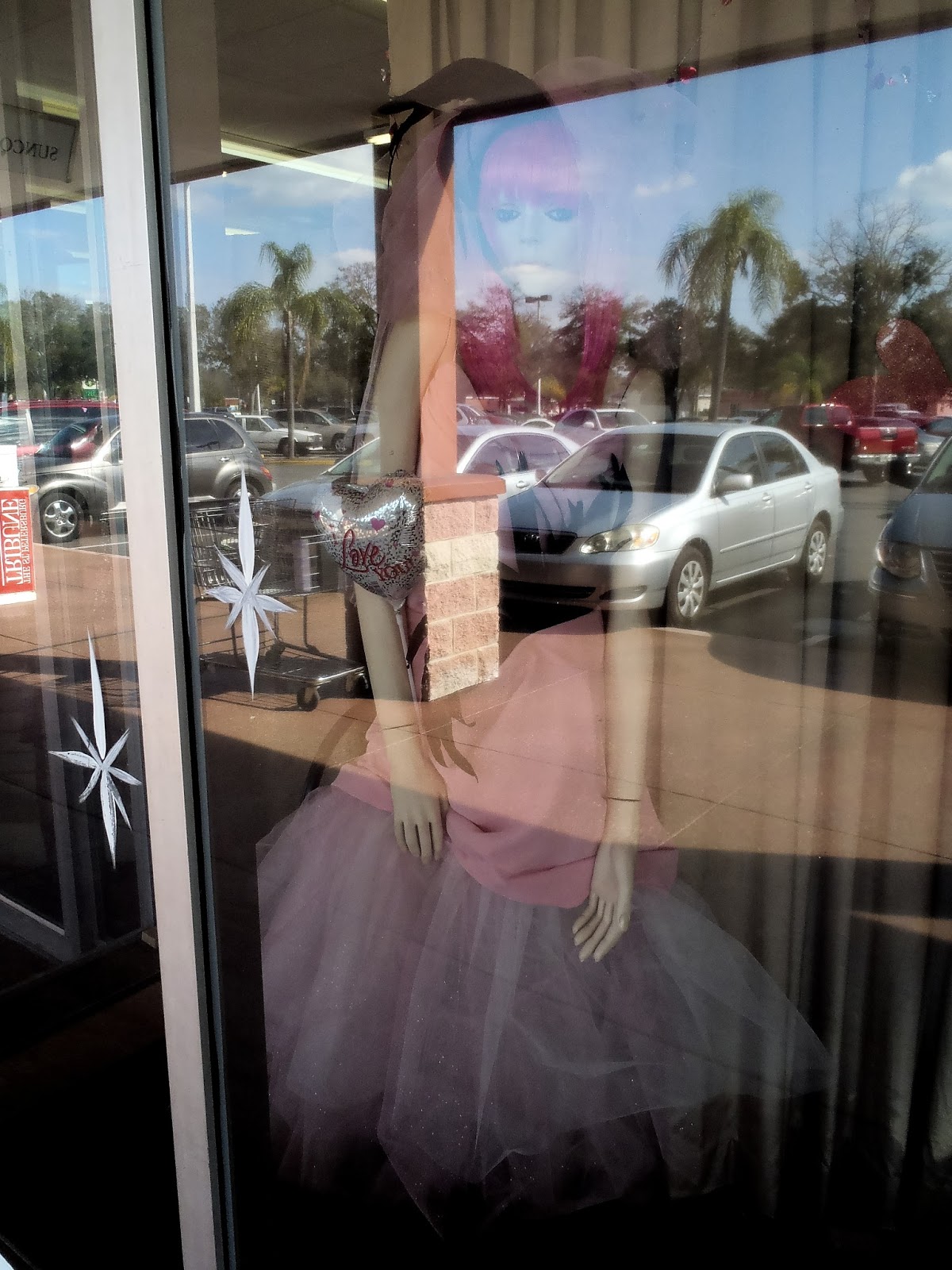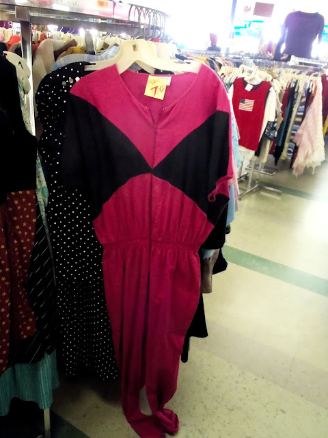 I think this thrift store wins for the best all pink outfit. They even put it on display. Wig included.