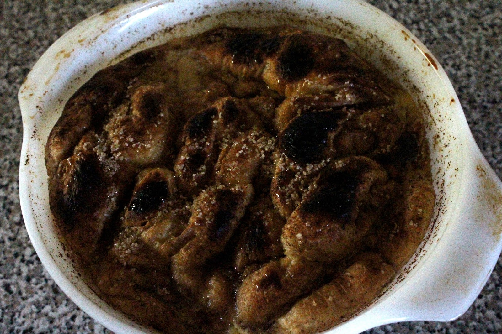 Place a plate over the croissants to further smoosh them then cover the dish and place it in the refrigerator overnight or as little as thirty minutes. The next morning, preheat your oven to 350 degrees then bake, covered, for forty to forty-five minutes. Now this is where it gets interesting; uncover, pour course sugar over the top and broil for one to two minutes.