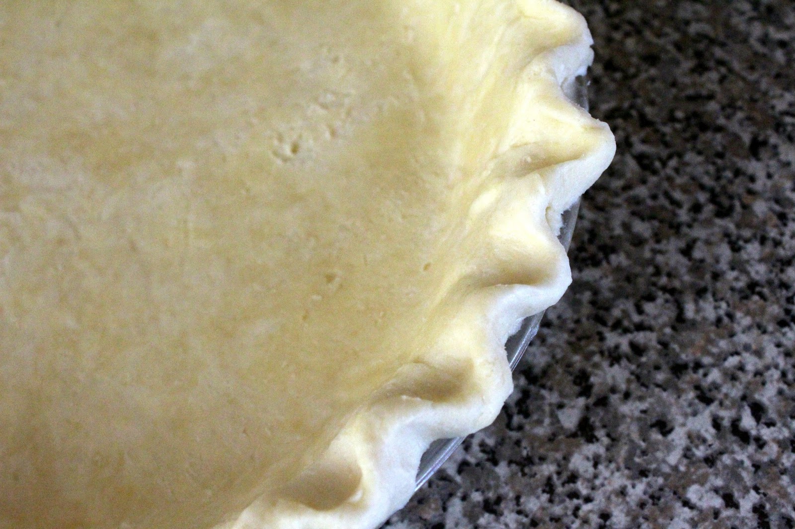 Now take out your chilled rolled out pie crust, trim any extra long hanging crust and flute the edge with an index finger and your other thumb and index finger.