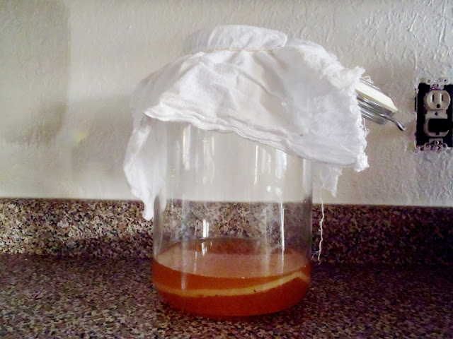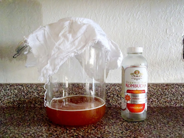 Now a SCOBY stands for Symbiotic Culture of Bacteria and Yeast and is what ferments the tea. I read Paprika’s tutorial on how to grow your own SCOBY and got started immediately. I used GT’s Gingerade Raw Kombucha and combined it with cooled sweetened tea made with 1 cup water, two tablespoons sugar and one tablespoon black tea.