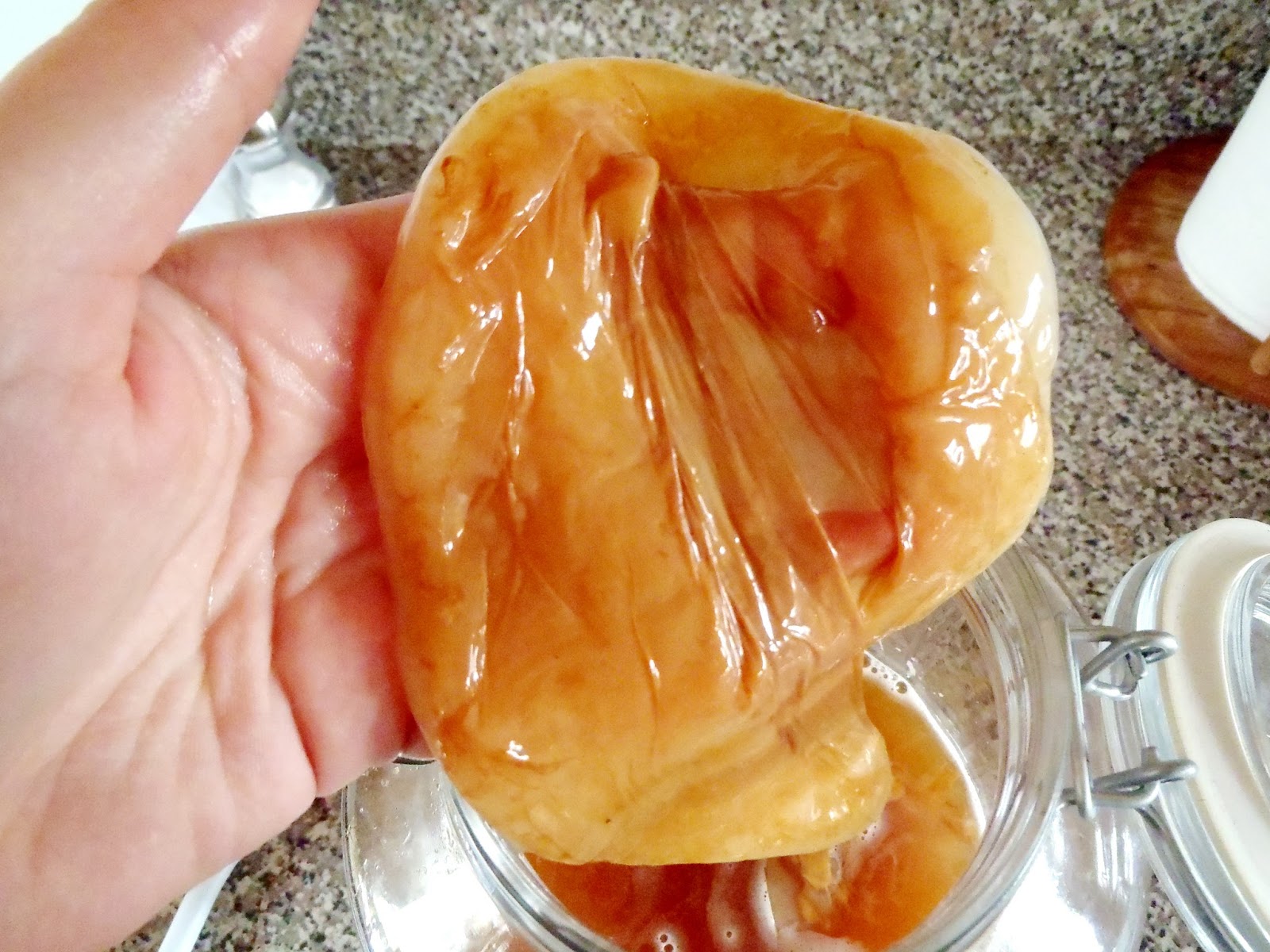 Actually I grew two, all for $3.19. What is Kombucha? Google it and you can find tons of information. Basically it is a fermented tea beverage that aids in digestion, supports the immune system, detoxifies and energizes along with other things. It tastes very tangy and is an acquired taste. I wasn’t too fond of it at first but after my first bottle I was hooked. However, at $3.19 a bottle it can get pretty expensive to drink one a day. That’s when I decided to try my hand at growing my own.
