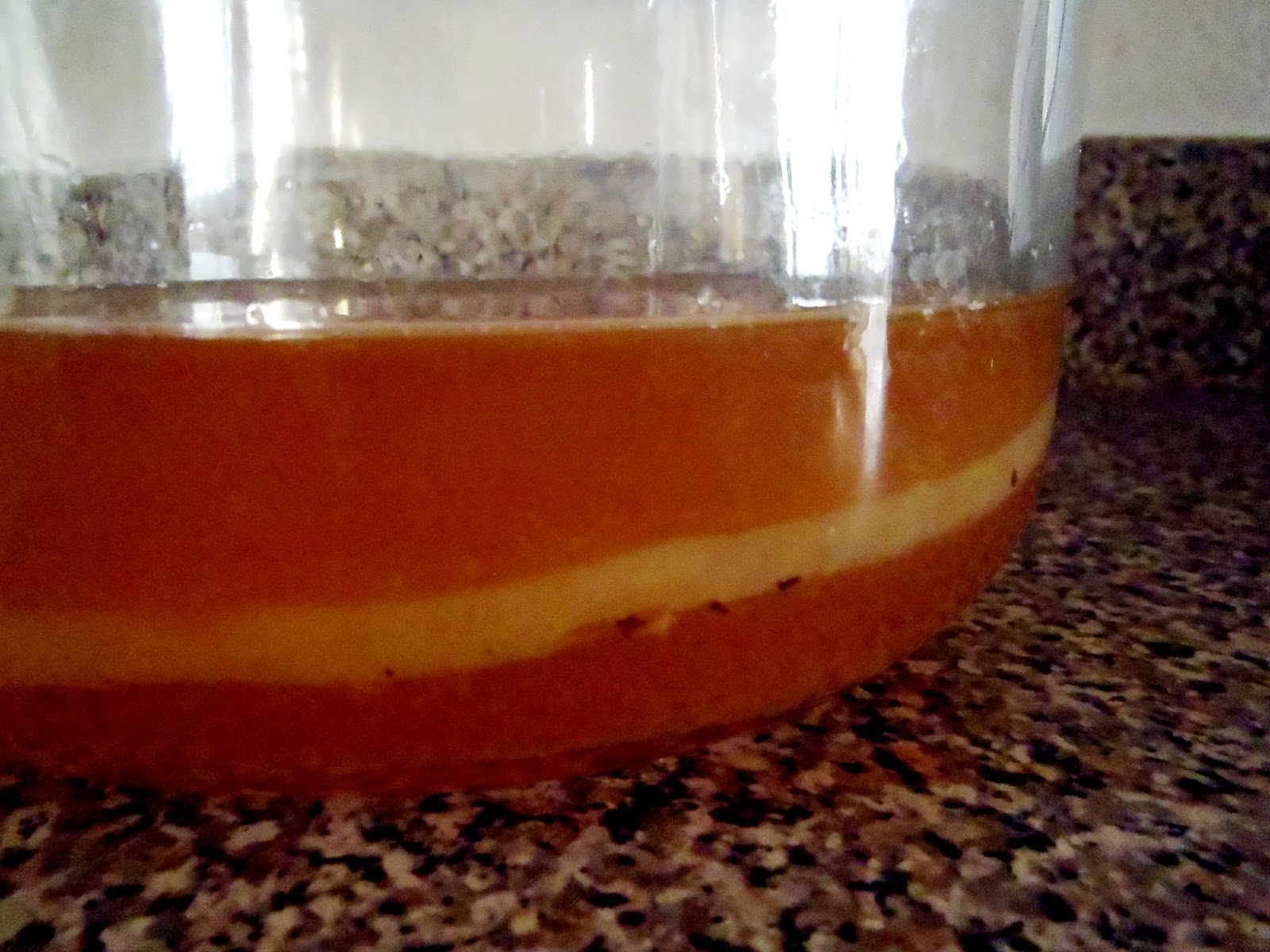 I was worried the ginger in it would prevent the SCOBY but after eight days in my dark pantry, I had this.
