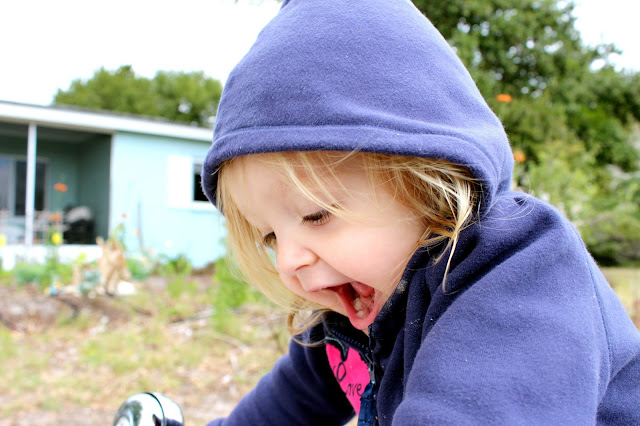 Now she begs to ride the tricycle at least once a day. We usually just take a five second trip around the  house, actually, it probably takes .47th of a second to take a trip in the house. So we took it a step further and had fun outside.
