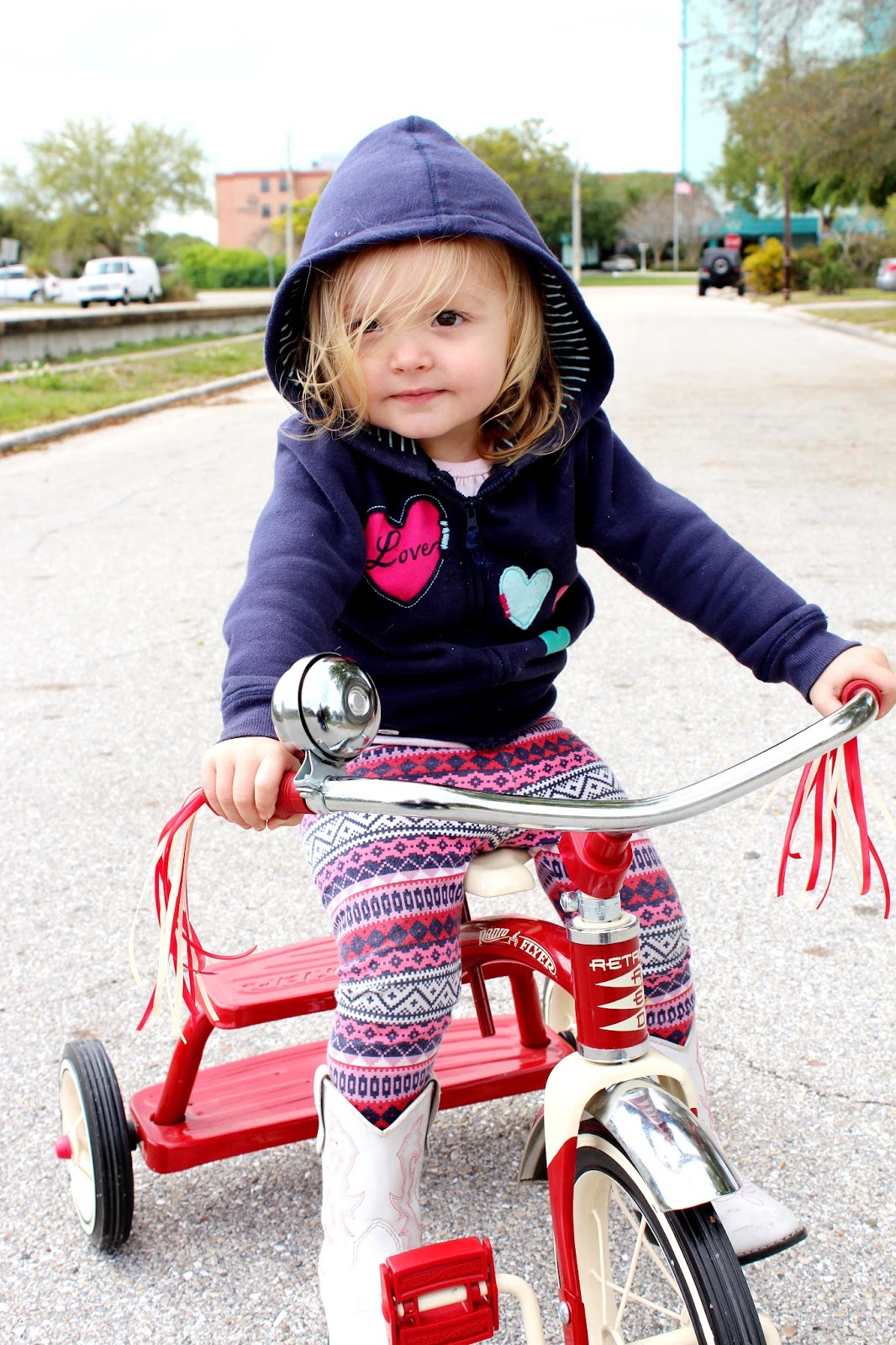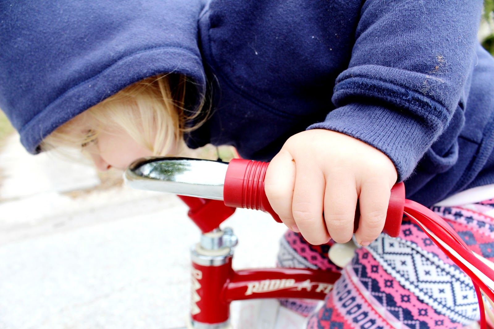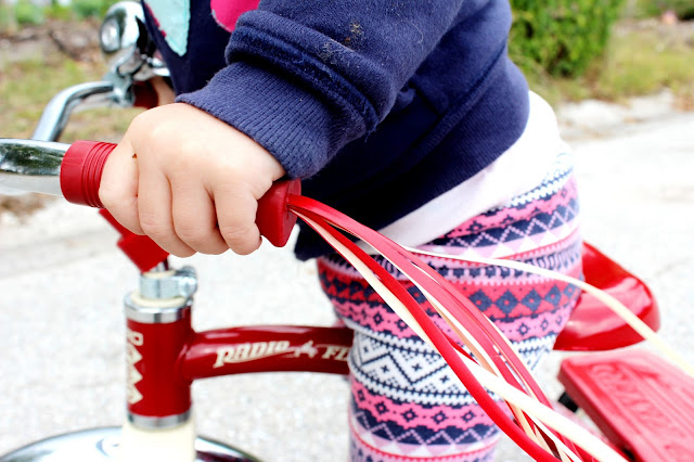 Eliana was, um, unimpressed. Eventually she warmed up to pushing it around the house and ringing its bell but still would refuse to sit on it. Until my dad came to town and asked her if she wanted to ride her tricycle and BINGO. Seriously, Grandparents must have some secret code language to coerce toddlers into doing what they say. Man, I wish I knew the secret code.