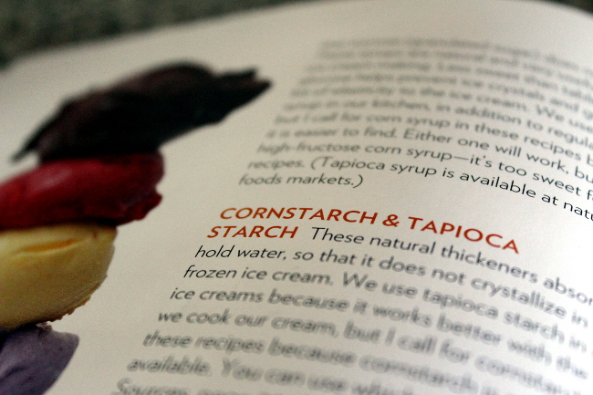 When I first opened her book I went straight to browsing recipes, that’s when I saw the ingredient list and closed the book. I thought, what’s the point in making something homemade if you are just going to use what they use in the store?? Reading her explanation put it into perspective to me. Egg yolks are called for in ice cream recipes to thicken the cream by binding to water, but Jeni explains that this is unnecessary since the protein in milk does this. Her trick is boiling the milk and cream with enough sugar so it won’t curdle. She uses corn syrup (glucose) in her recipes for its water-binding capabilities, tapioca (or corn) starch as, what she calls, an insurance policy, and cream cheese to give the ice cream body.