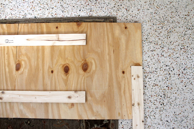 Then I created legs by screwing the shorter 1×3’s to both edges of the plywood.