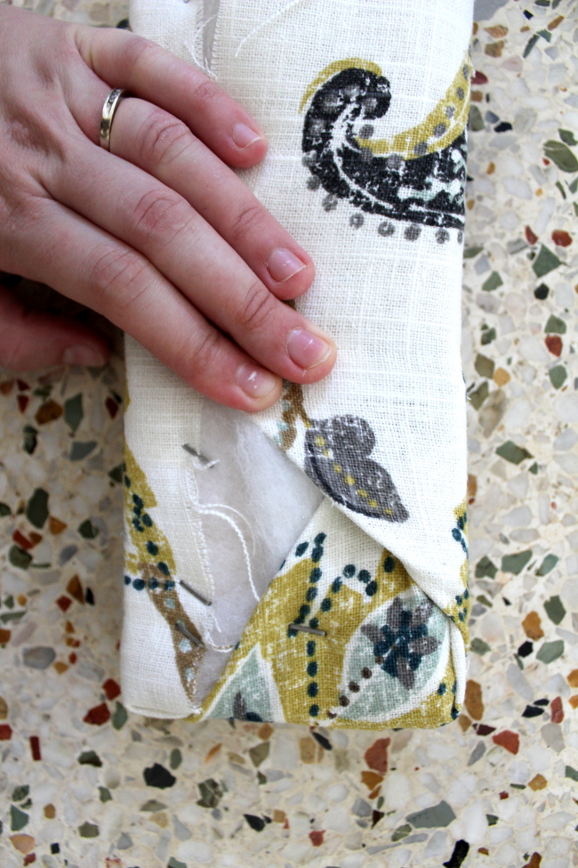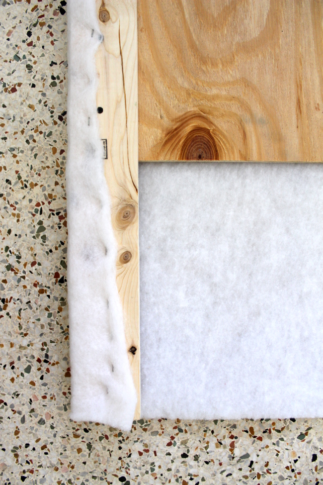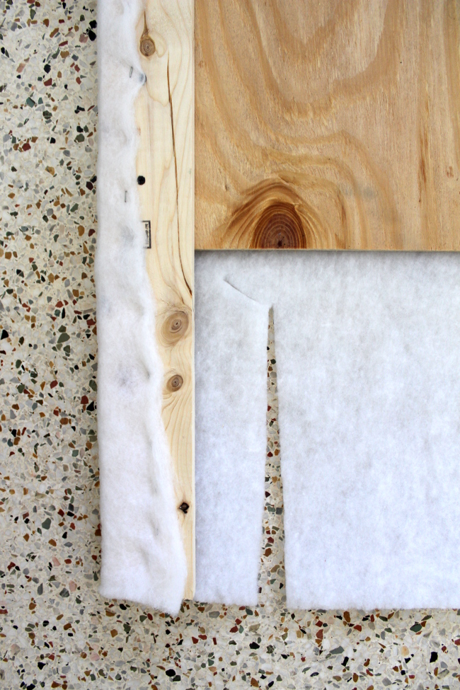 Once the structure was build, it came time to actually upholster it. There’s really not much to explain; center the headboard on the fabric, leaving two inches per side and staple it around while pulling taught.